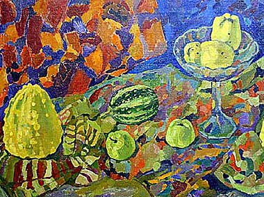 Pictures with green being a dominating color are usually best for a kitchen. Every process that goes on in the kitchen, whether it be cooking food or eating it, is related to the natural element. This element of nature is affiliated with the green color. Best-suited paintings for this task are usually landscapes of green fields or trees. Another color that's good for a kitchen would be red (such as compositions of fresh harvests). The red color is related to fire, which is symbolically a domestic element. Aside from symbolism, it is a long-known fact that the red color has a strong property of stimulating one's appetite.